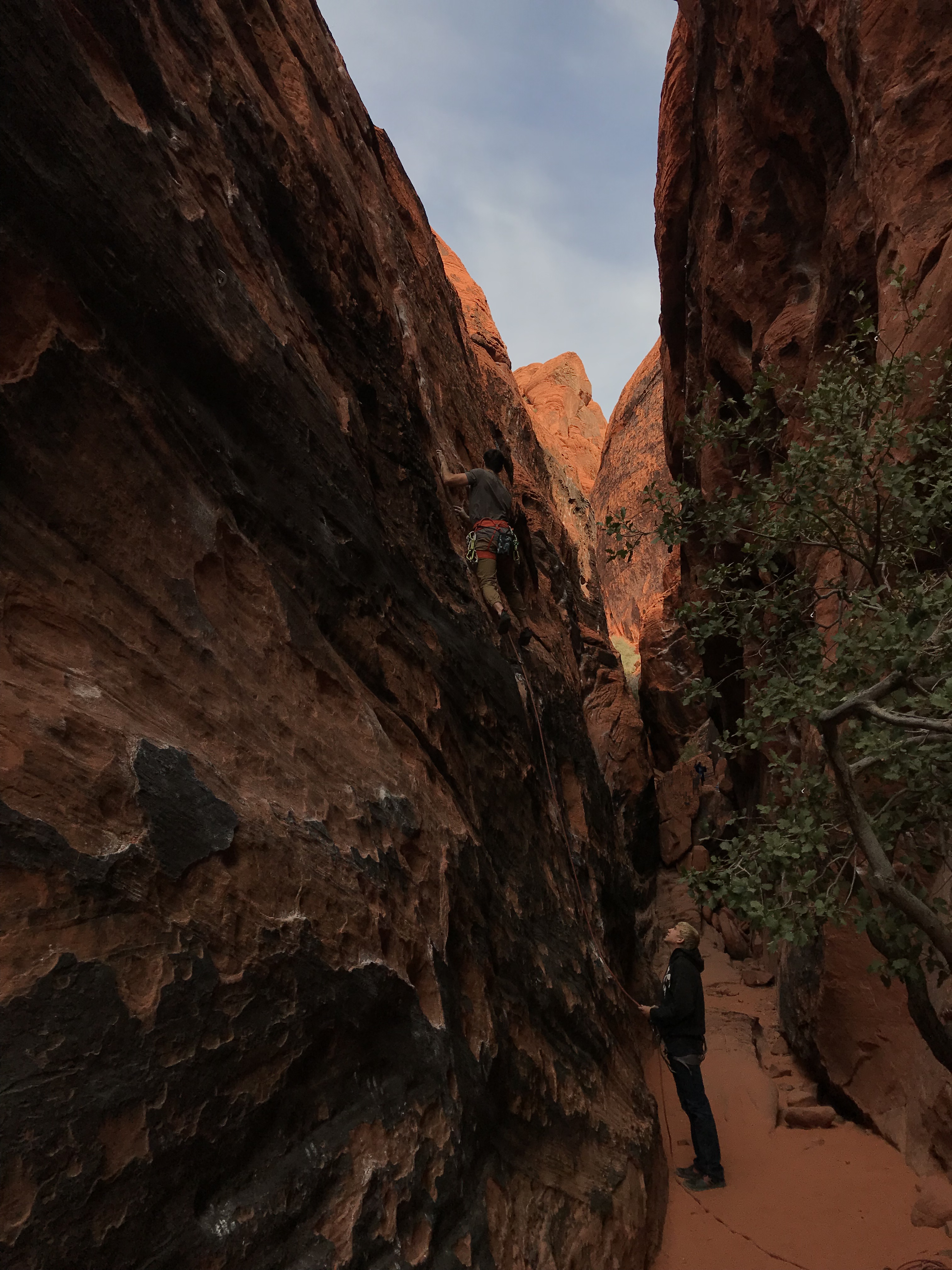 We started off in the Black Corridor, such an awesome spot. I instantly fell in love, cannot wait to go back. Brandon says this is a very popular spot so we did our best to be one of the first ones there. The bright red walls and blue skies and silky red sand was enchanting, and we had a lot of wall to cover. We got on a few warm up climbs right away and I got shut down pretty hard. I was feeling shaky and scared, unsure of my feet. Discouraging feeling right off the bat, but I was there to have fun and I was with some of my favorite people. I had nothing to complain about.